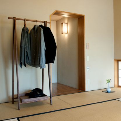 コサインのハンガーで15着以上掛かる収納力と、たたんで移動できる身軽さ、どこに置いてもシンプルで飽きのこない美しいデザインと素材感が特徴です。