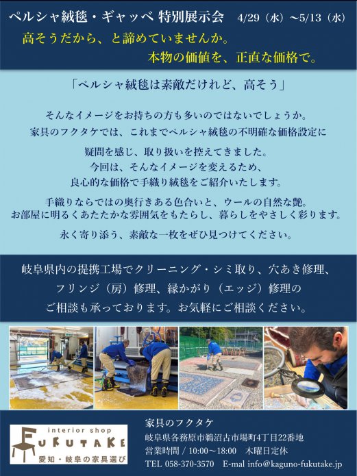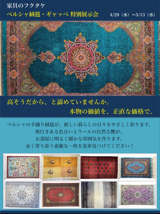 家具のフクタケのつぶやきペルシャ絨毯・ギャッベ 特別展示会4/29(水)~5/13(水)