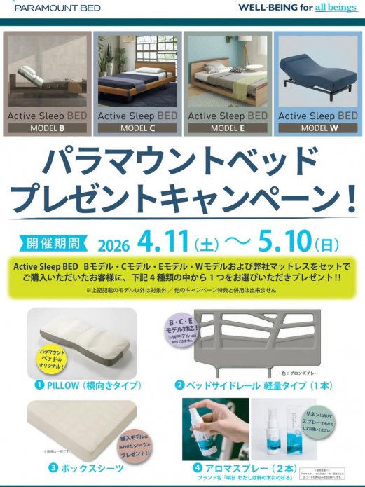 ホーム > 家具屋のつぶやき > パラマウントベッドプレゼントキャンペーン! 4.11(土)~5.10(日)