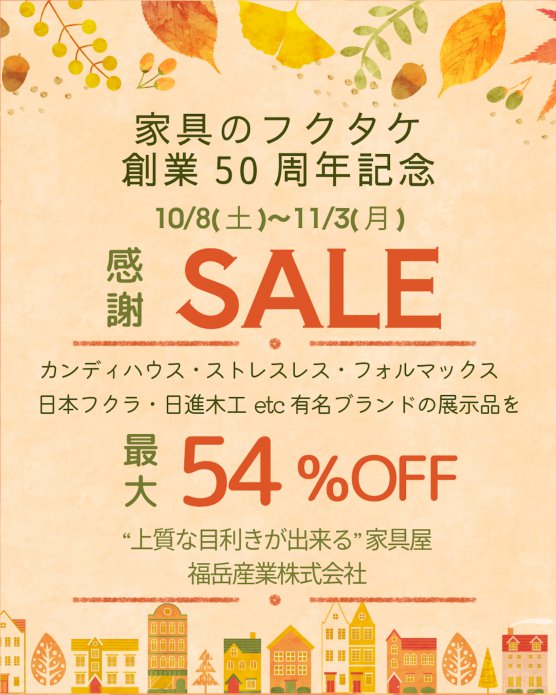 10/18(土)〜11/3(月)家具のフクタケ創業50周年記念感謝SALE開催いたします‼️