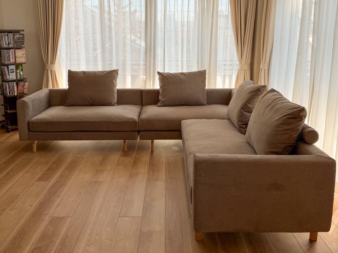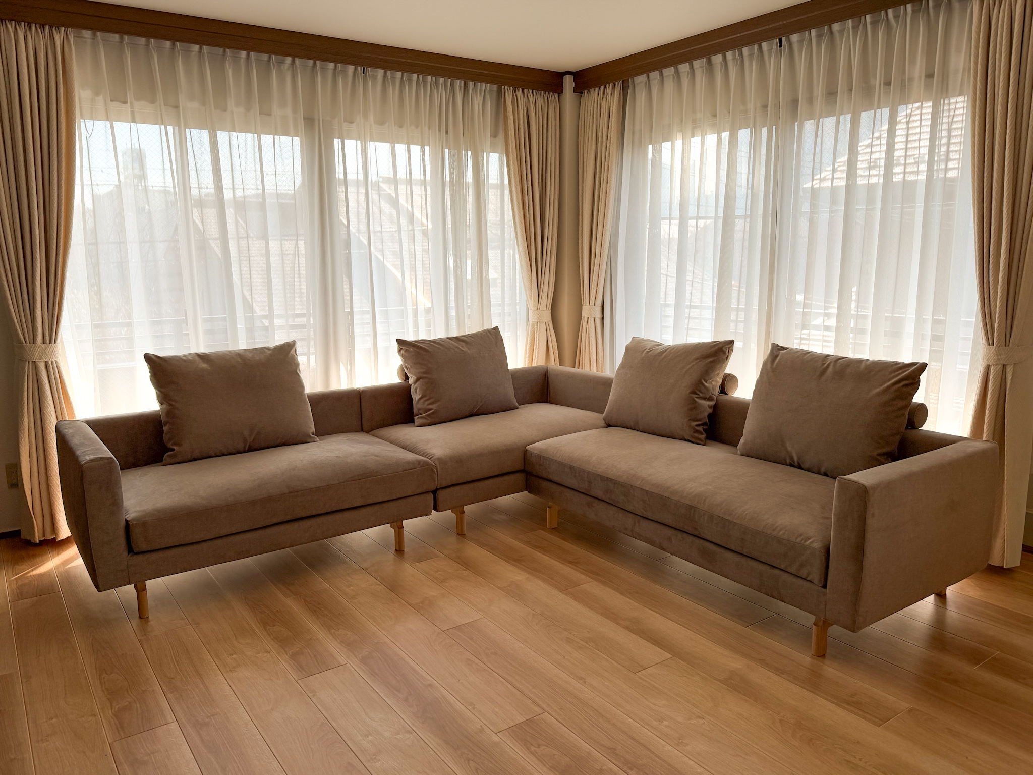 明るい窓辺に沿うように美しく収まり、軽やかな佇まいでありながら、くつろぎの質をしっかりと高めてくれる一台となりました。